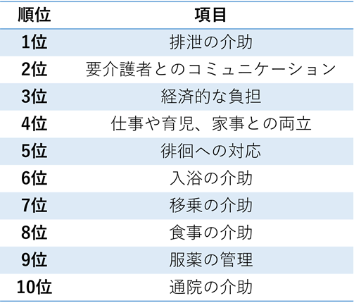 ある調査結果によると、介護で大変なことランキングTOP10は次のとおりとなっています。